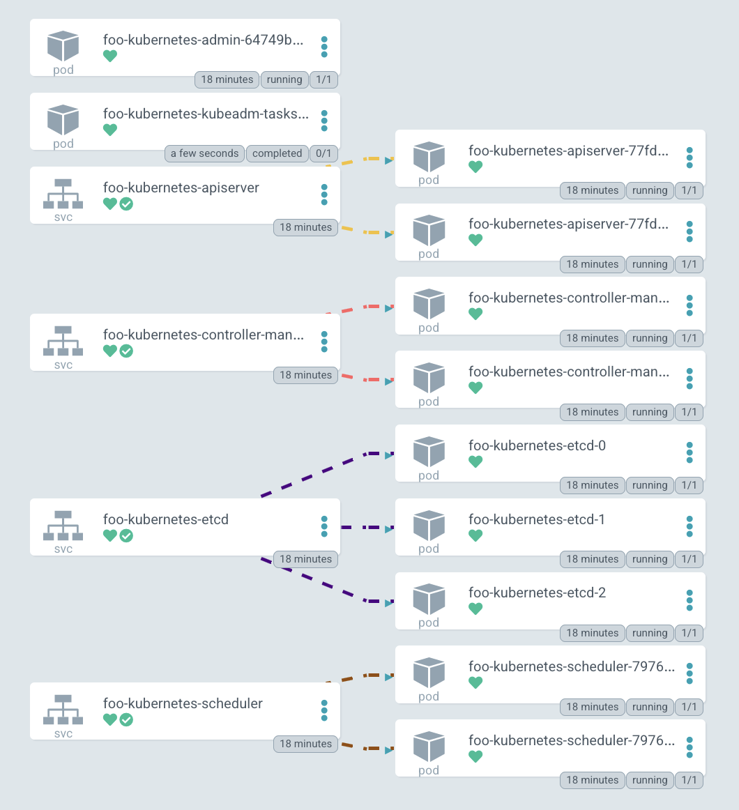這是已部署叢集的圖表。您可以看到所有 Kubernetes 元件的服務:apiserver、controller-manager、etcd-cluster 和 scheduler。右側是它們轉發流量的 Pod。